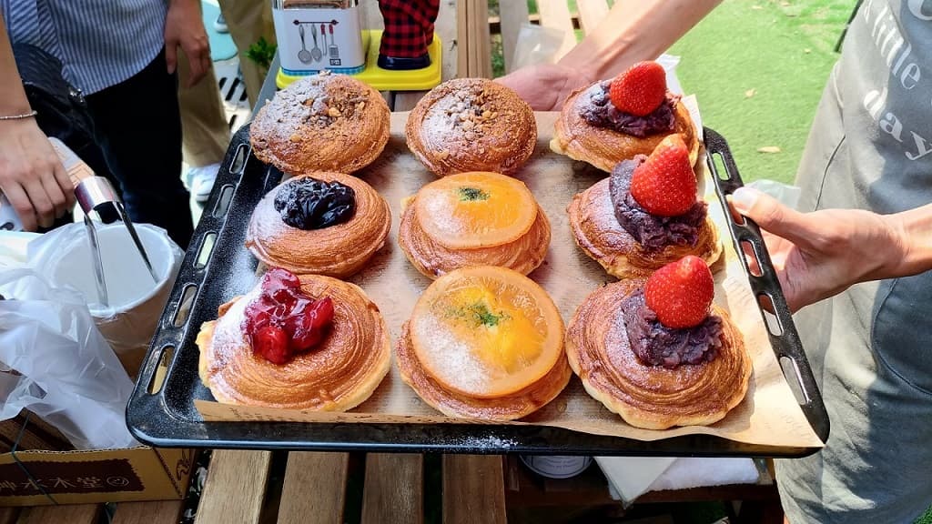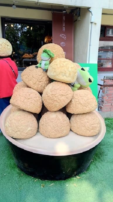 店家門口有開放大型台泡芙合影,手作新鮮泡芙和麵包及糕點為特色,且有提供兩頂泡芙帽讓遊客免費戴與拍照.