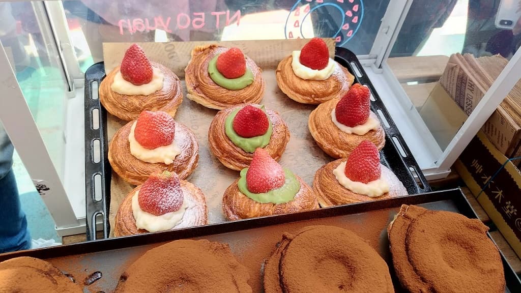 下午限量的”草莓甜甜圈”..一個50大洋,店員從店家門口拿出來時,看到滿滿的不同種類的草莓甜甜圈,不由自主地跟著排隊想買來嚐鮮看看. 有抹茶/牛奶/紅豆/巧克力等口味可以選擇. 咬下去的口感,甜甜圈外表是酥脆的,加上甜甜大大的草莓….一整個心花怒放!
