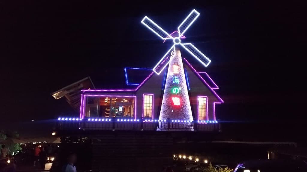 且到轉彎處,馬上就看到閃亮亮的風車造景. 真的是越夜越美麗, 而且人潮/車潮不斷, 就像是要一起欣賞美麗的夜景, 白天與晚上各是不同的感受, 所以可以在黃昏時刻再上山, 就可以體會到大自然星空的轉換, 相信心境也會有所不同,而心情也會不時的愉悅開心!!