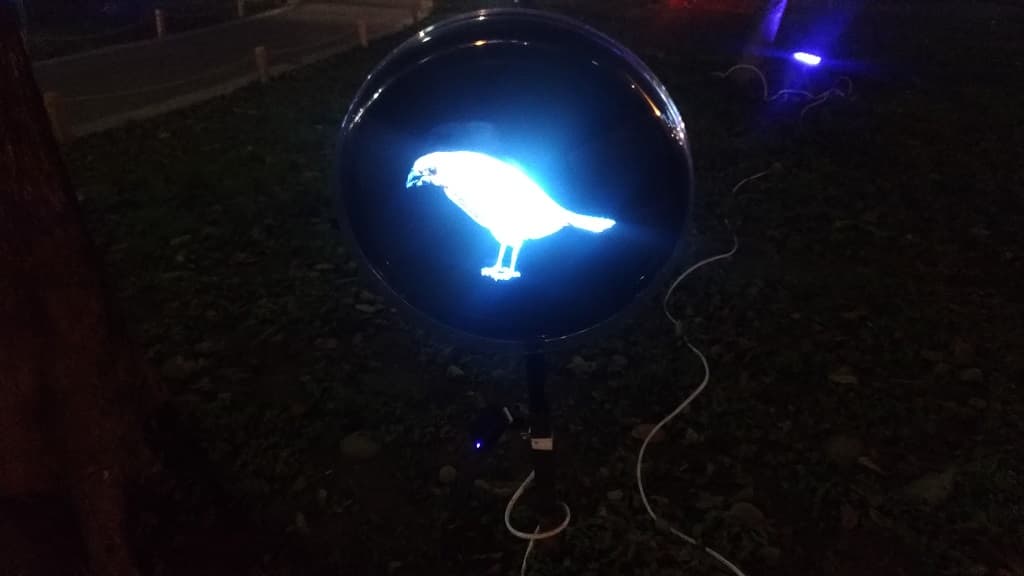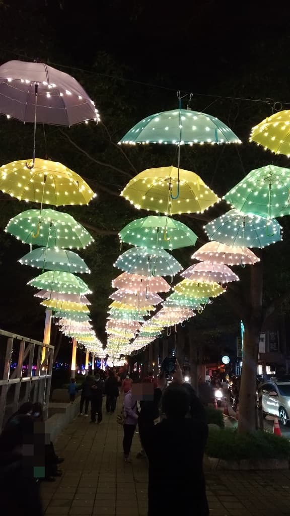傘閃動人-夜色降臨後,飄浮在空中的七彩光傘交錯,創造出繽紛空間.