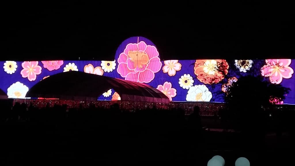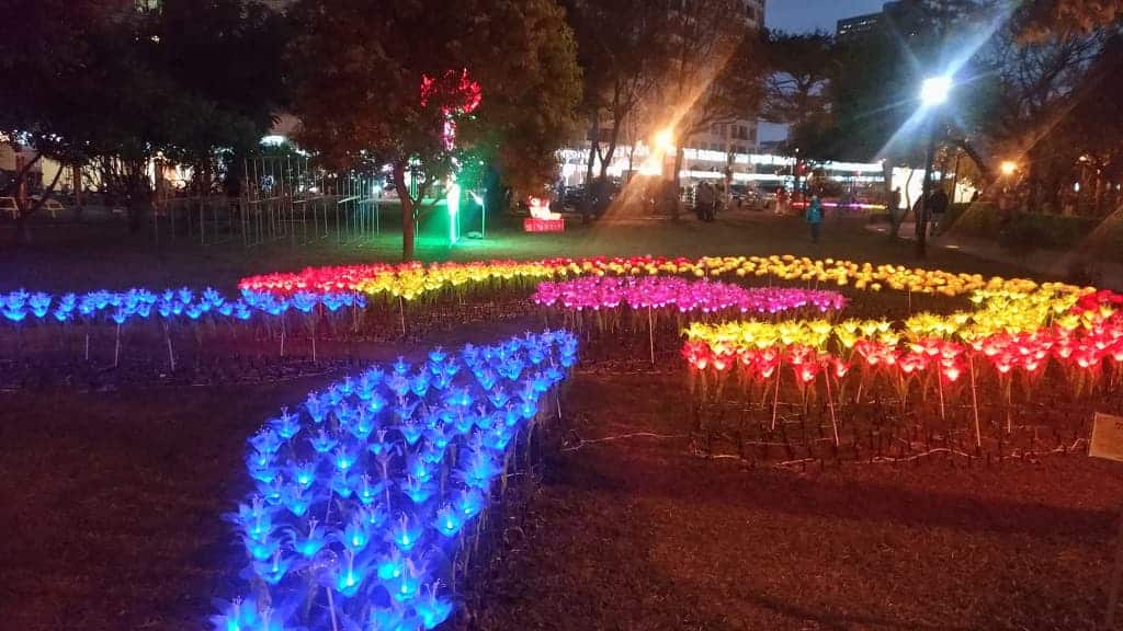 「全台最大」透明網格屏幕面積廣達500平方公尺光雕秀、「國內第一」首創超過萬朵LED七彩變色玫瑰花毯-光之花毯秀,隨著音樂撥放不同色彩的玫瑰造型燈,蠻漂亮的.
