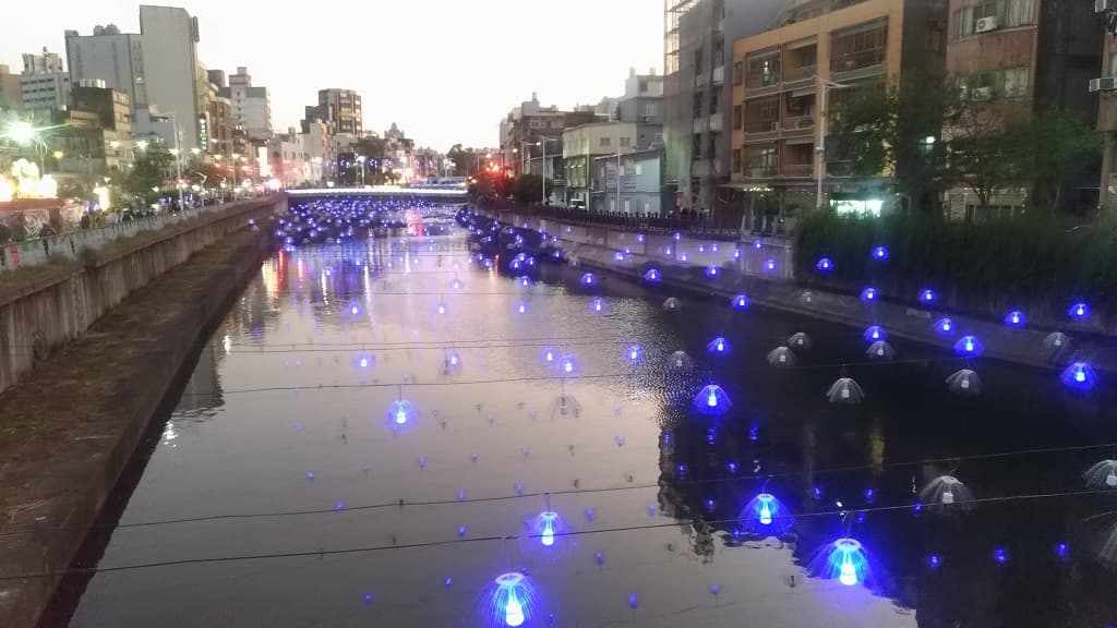 老街溪-以「數大便是美」的大量「水母燈」懸掛在老街溪河段的上空處.