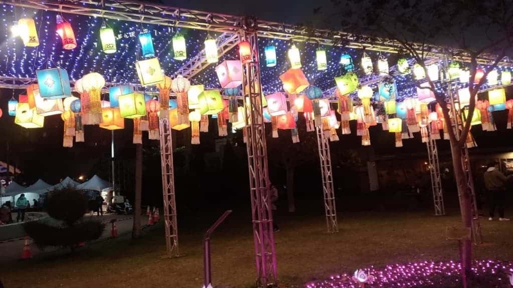 蘭納燈籠隧道,穿過隧道便象徵得到了無窮的祝福,搭配越南的斗笠拼接成風鈴般的藝術裝置,在台灣也可以享受到越南的文化風情.