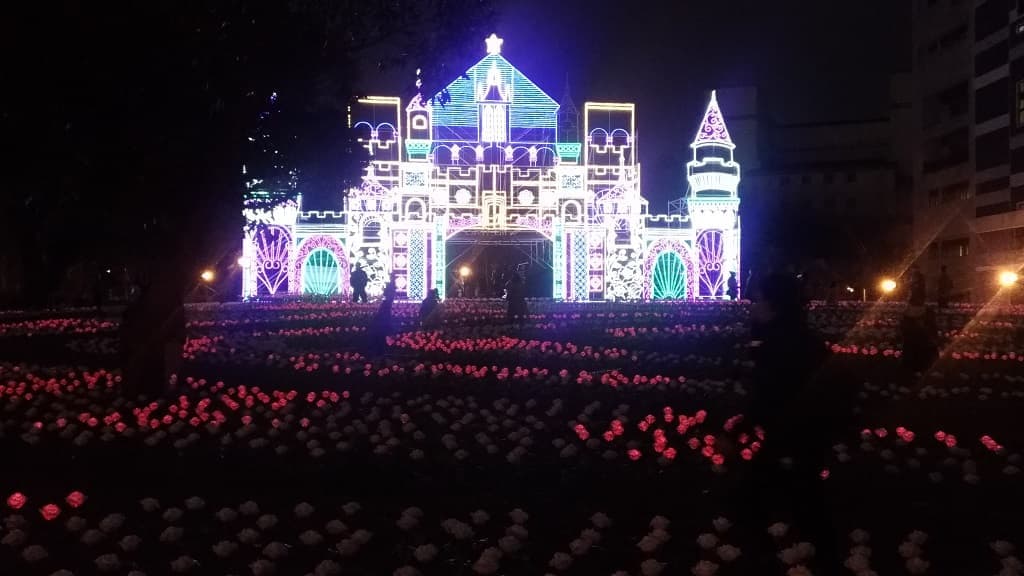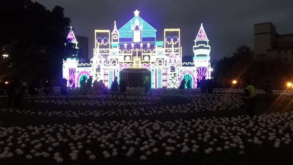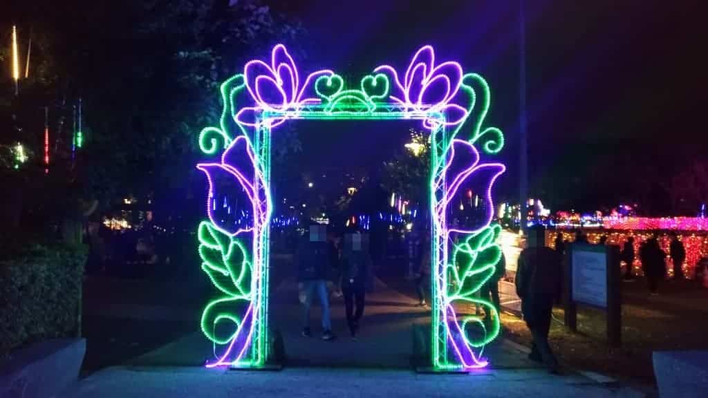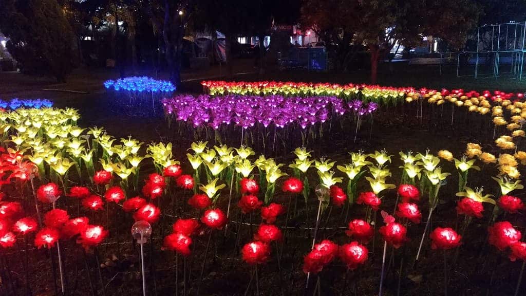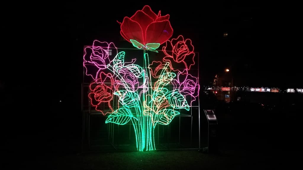 「全台最大」透明網格屏幕面積廣達500平方公尺光雕秀、「國內第一」首創超過萬朵LED七彩變色玫瑰花毯-光之花毯秀,隨著音樂撥放不同色彩的玫瑰造型燈,蠻漂亮的.