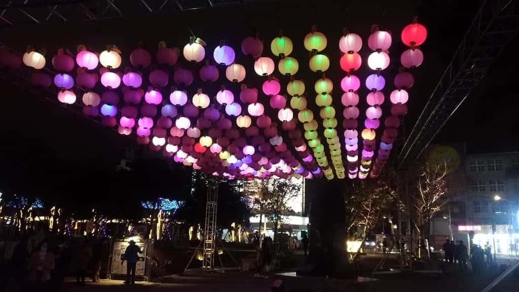 蘭納燈籠隧道,穿過隧道便象徵得到了無窮的祝福,搭配越南的斗笠拼接成風鈴般的藝術裝置,在台灣也可以享受到越南的文化風情.