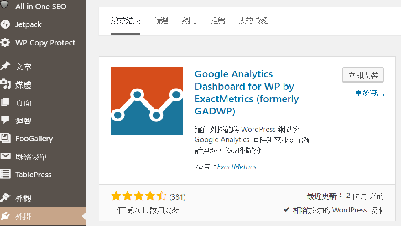 一開始在WP後台的[外掛]-[安裝外掛]中,搜尋欄位中輸入[Google Analytics Dashboard for WP],按下[立即安裝], 然後[啟用],就完成安裝了.