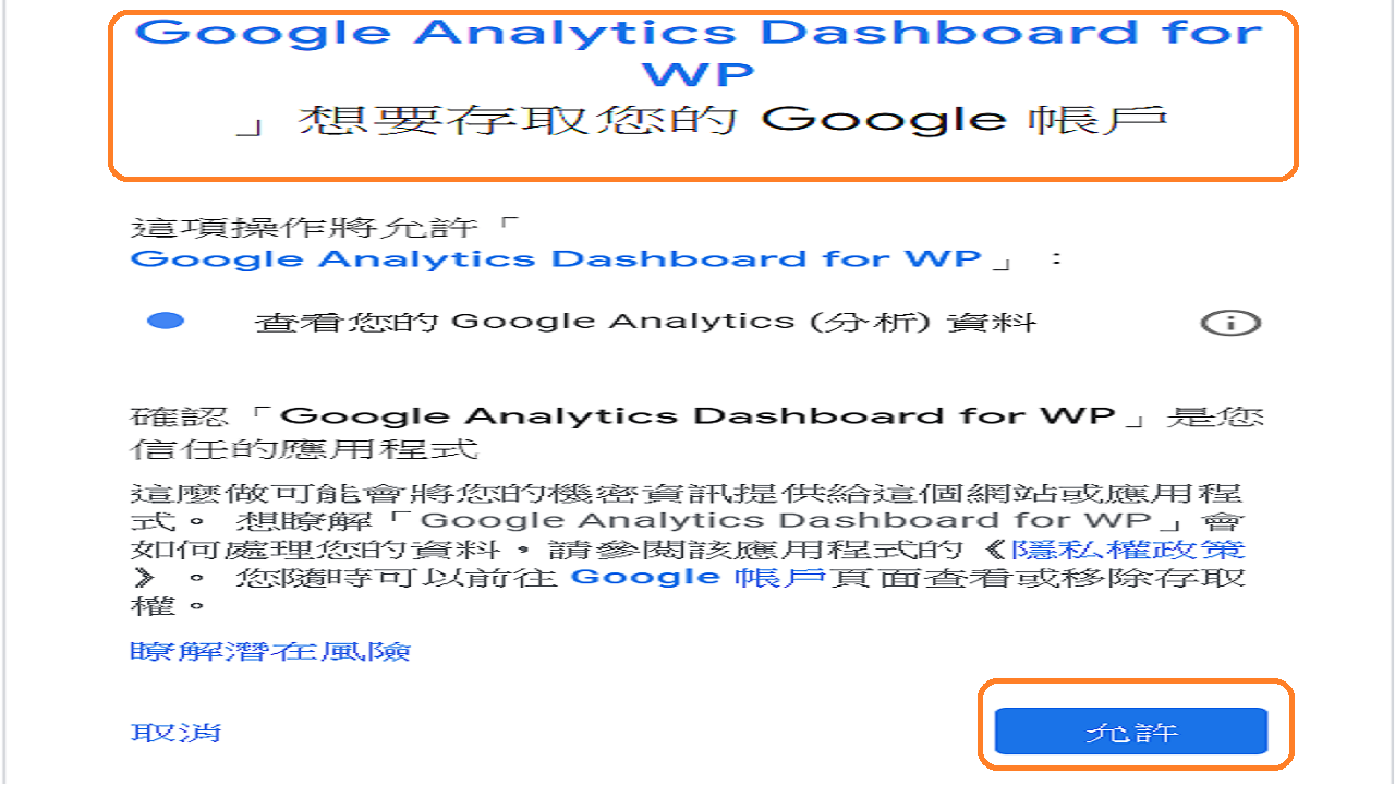 此時顯示畫面為此外掛會存取GA的帳戶, 按下[允許], 如此一來, GA的內容才會同步到WP後台裡.