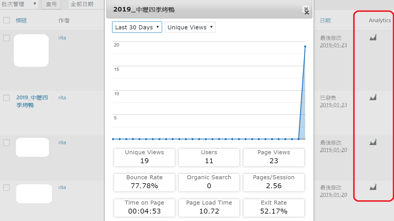 在WP後台的[文章]-[全部文章]中, 點選紅色框的圖示, 就可以了解每篇文篇的實際統計分析資料!