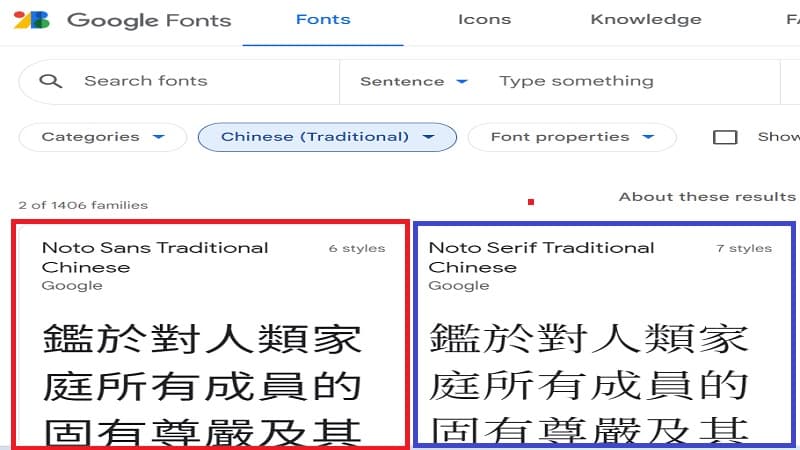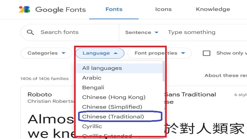 在紅色框中選擇合適的語言[Chinese-Traditional], 選擇之後就會出現Noto Sans(思源黑體)與 Noto Serif (思源宋體)這二個家族.
