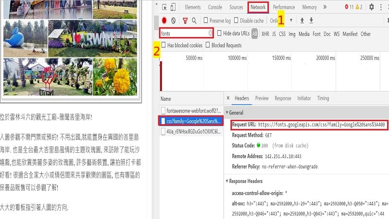最後別忘了清除網站內的cache, 再次回到Google Chrome中, 檢查是否還有其他Google Fonts的外部請求, 也順便確認挑選的字型是否在本機上使用.