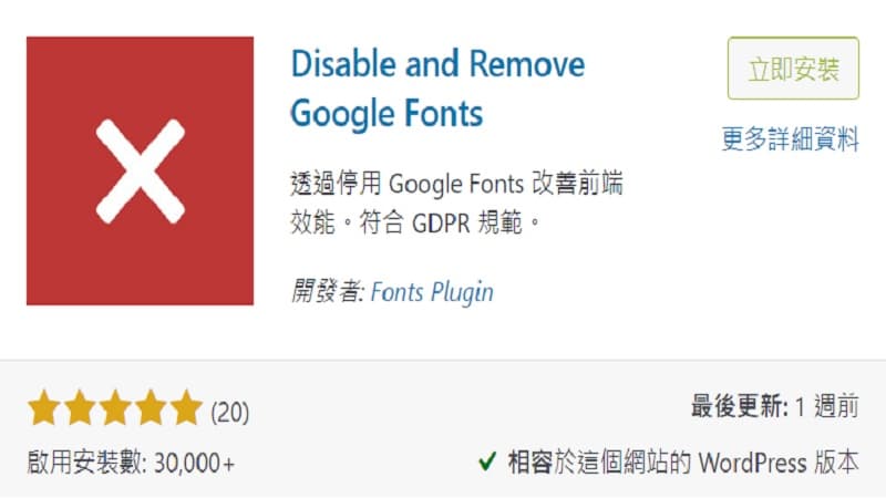 Disable and Remove Google Fonts– 此外掛安裝且啟用之後, 不需設定就完成了.