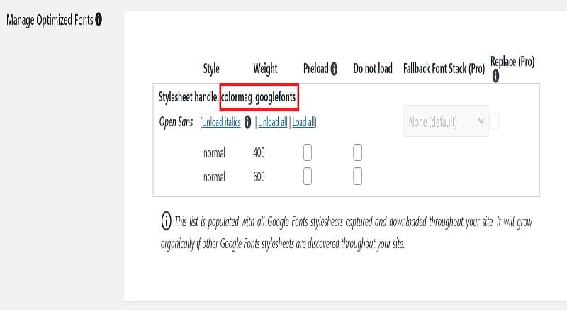 因為代碼中需要一個keyword, 且每一個佈景主題中所需的名稱也不盡相同, 所以利用OMGF這外掛來找尋. 這是一開始OMGF的外掛畫面, 直接點選紅色框中的[Start optimization]按鈕, 就會產生stylesheet handle的名稱, 可以看到 [colormag_googlefonts] 就是所需的關鍵字!