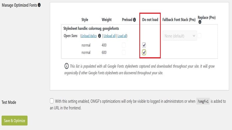 OMGF-只要勾選不需要用的字型就可以了, 然後按下[Save & Optimize]就完成移除內建的Google Fonts.