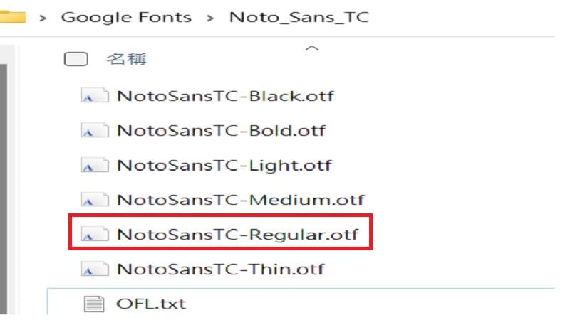 解壓縮之後, 挑選NotoSansTC-Regular.otf這個字型, 其他檔案名稱以粗體大小不同而分類.