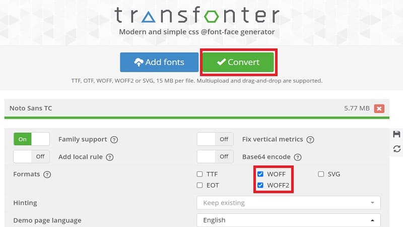 進入轉換字型網站之後, 把需要的檔案, 直接在點選[Add fonts]加入, 預設會勾選WOFF/WOFF2這二種為主流格式, 然後確認無誤之後, 按下[Convert]就可以在線上做轉換了.