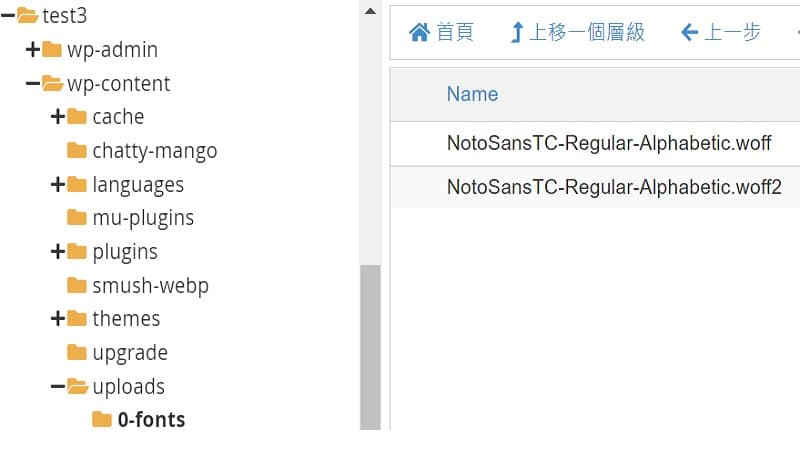 再來就是把那二個檔(WOFF/WOFF2), 上傳到Wordpress server 中的位置. 這裡把它們放到下方路徑裡.