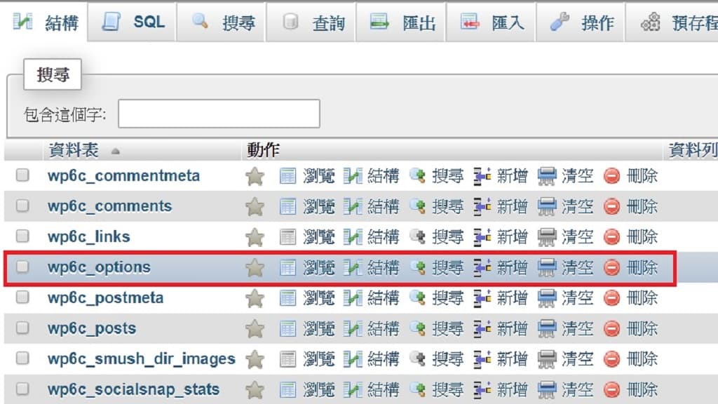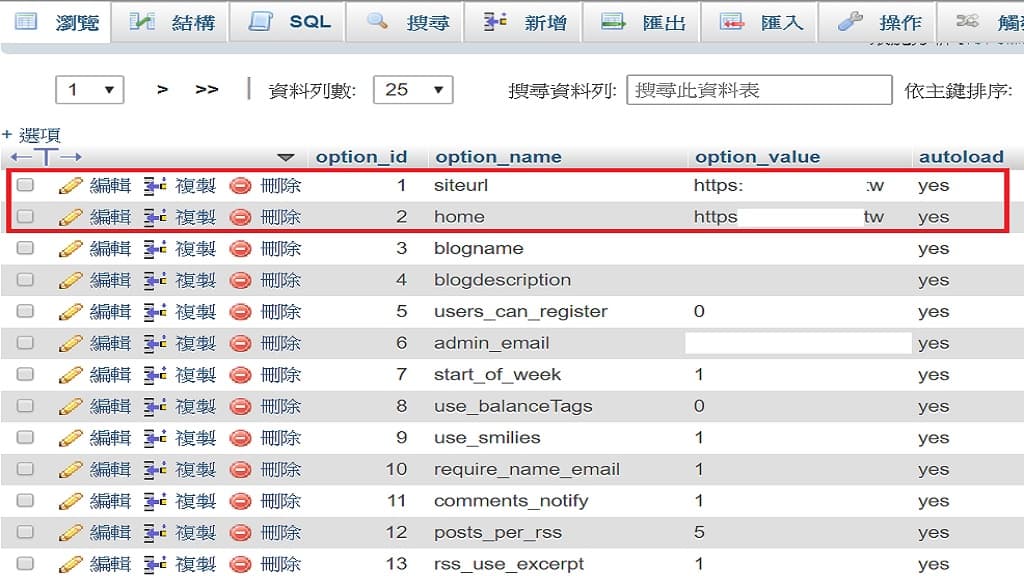 或是直接修改新主機cPanel中的[phpMy管理]\資料庫\結構\XXX_options, 修改siteurl與home這二個選項中的內容(option_value),變更成新網址!如下圖所示: 名稱不一定會相同, 依原先資料庫為主!