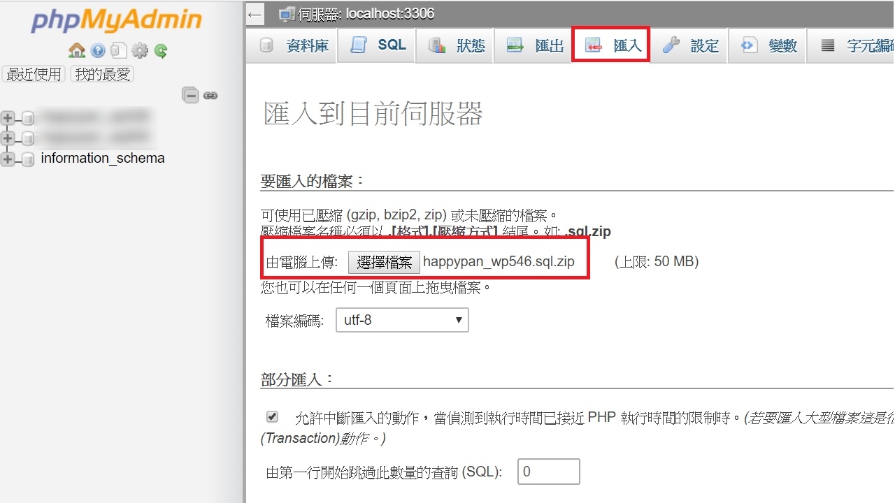 2.指定新主機中的資料庫之後,匯入原先舊家的資料庫(無變更網址)或是已經修改好的資料庫(包含修改成新網址)