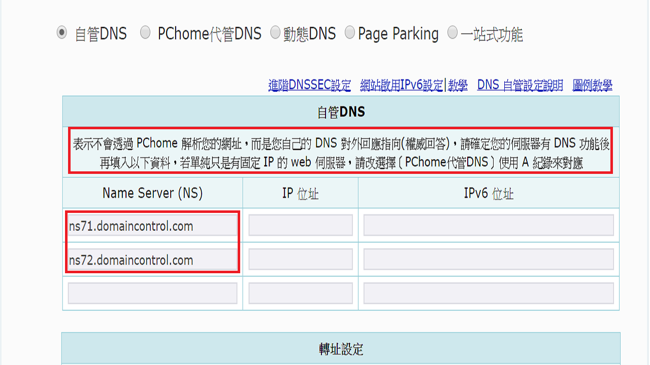 4.網址DNS的轉換  –> 設定新NS(name server)的位址.