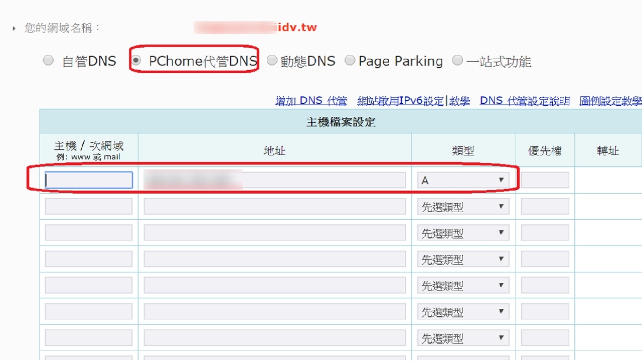 一開始要從新主機得到DNS二組位址, 或是代管DNS增加A記錄, 然後透過Pchome DNS管理去設定就可以了, 如下圖所示: