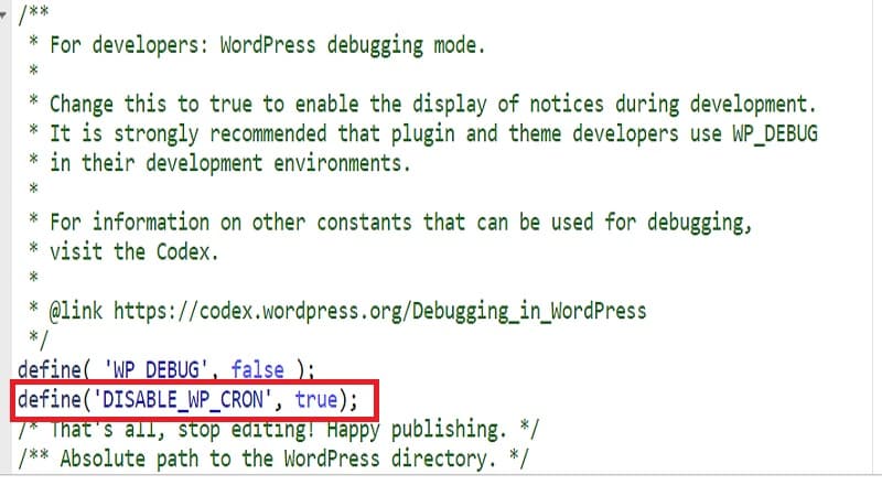 然後在下方內容之前, 輸入define('DISABLE_WP_CRON', true); 就可以關閉它了.