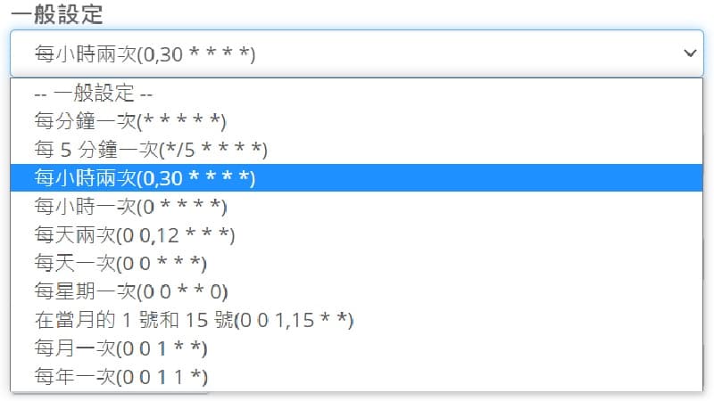 選擇設定, 大多數都設定每小時兩次居多, 但如果主機是用shared方式, 要記得詢問一下主機商, 是否有限制時間, 以BlueHost的主機來說, 只能設定15分鐘一次! 其他不同時間的設定, 可能會產生問題!