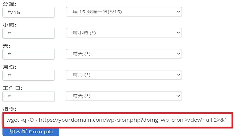 最後在[指令欄]中, 輸入以下代碼即可! 其中紅色粗體字修改成自己的網址名稱. 以下代碼簡介, 是利用wget的方式去執行此網域的wp-cron.php, 且不會發mail通知網站管理員.