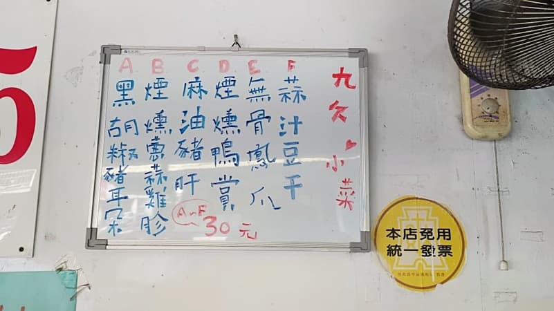 除了牆壁上的固定餐點之外, 在右方的白板上也會有不同變化的小菜, 其價位都是30元!