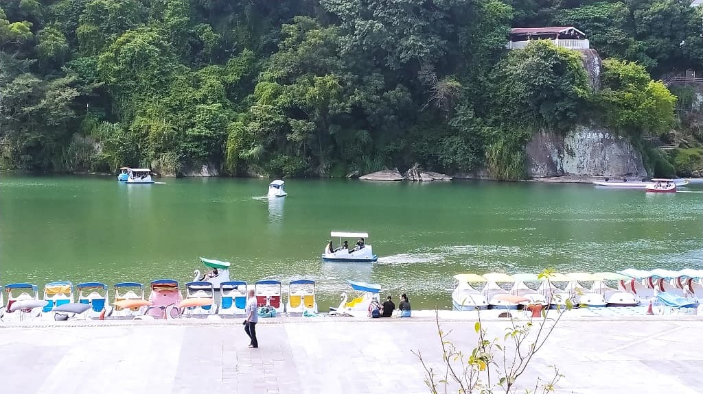 在天氣好的氛圍下, 踩著天鵝船悠閒在湖畔中穿梭.